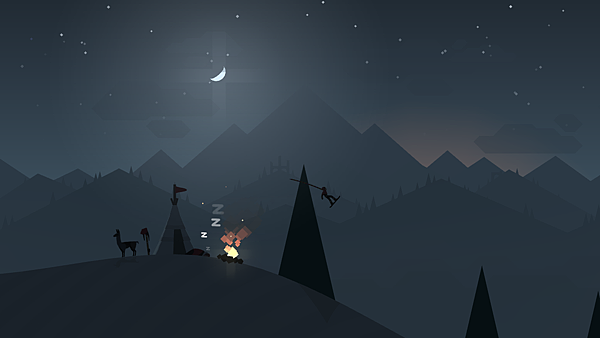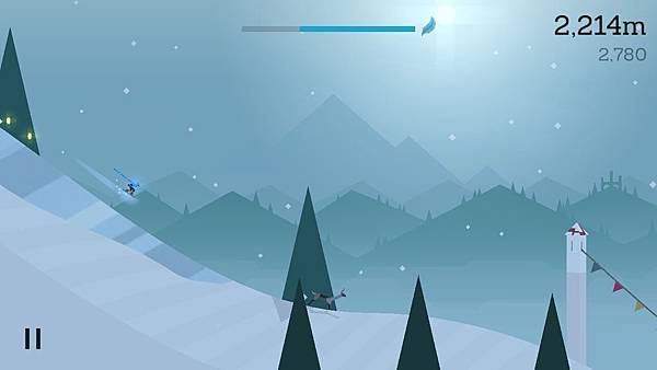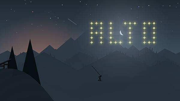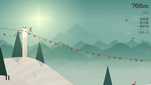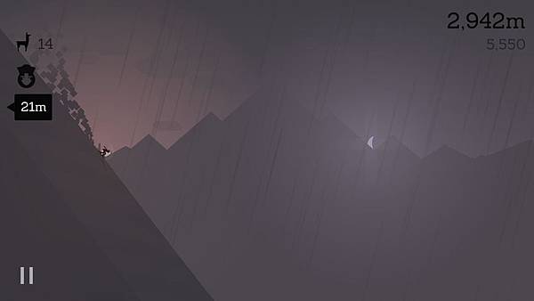 這是一款風格簡單的跑酷遊戲,主畫面很簡潔,滑雪、駱馬、彩旗、樹林和懸崖,Alto一個人在雪地裡變花樣奔馳,伴著滑雪聲和落雨聲,偶爾逗弄聖誕老人,再逃離追趕。畫面隨著遊玩的時間從清晨到夜晚移動,偶爾會有下雪、下雨甚至打雷,光影變化極美。