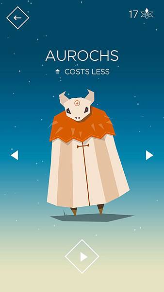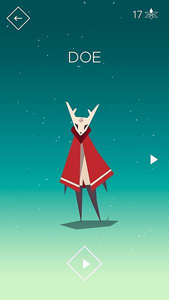 從封面的三角形點進去後,進行遊戲前就可以選擇人物。人物有三種,Doe、Aurochs(用100朵花解鎖)和Raven(用150朵花解鎖)。不同人物星空顏色不一樣,道具花費也不一樣,其餘沒有能力上的差別。