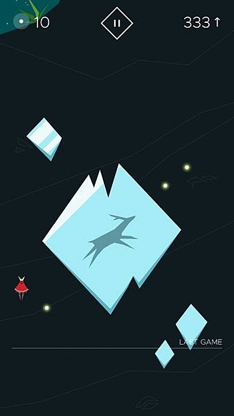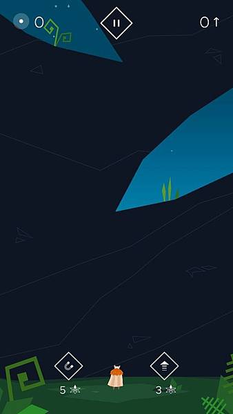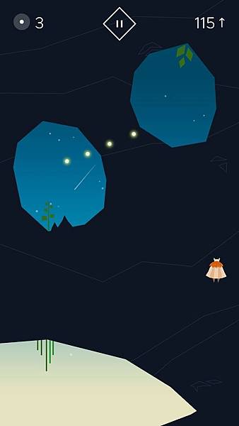 當人物的腳到岩石範圍時,在螢幕左右邊點擊,可以讓人物落在岩石上,然後向左或向右跳,按久一點可以跳更高。途中的黃點就是螢火蟲,然而除了加分以外,牠們No Function。