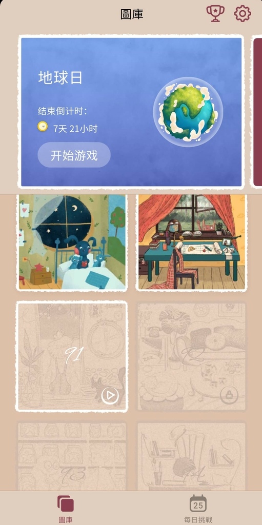 一進入主畫面能是一幅幅的關卡,上方有每日關卡以及不定期的活動,右上角可以進行設定和觀看得到的獎盃,下方按鈕也可以進入每日挑戰。